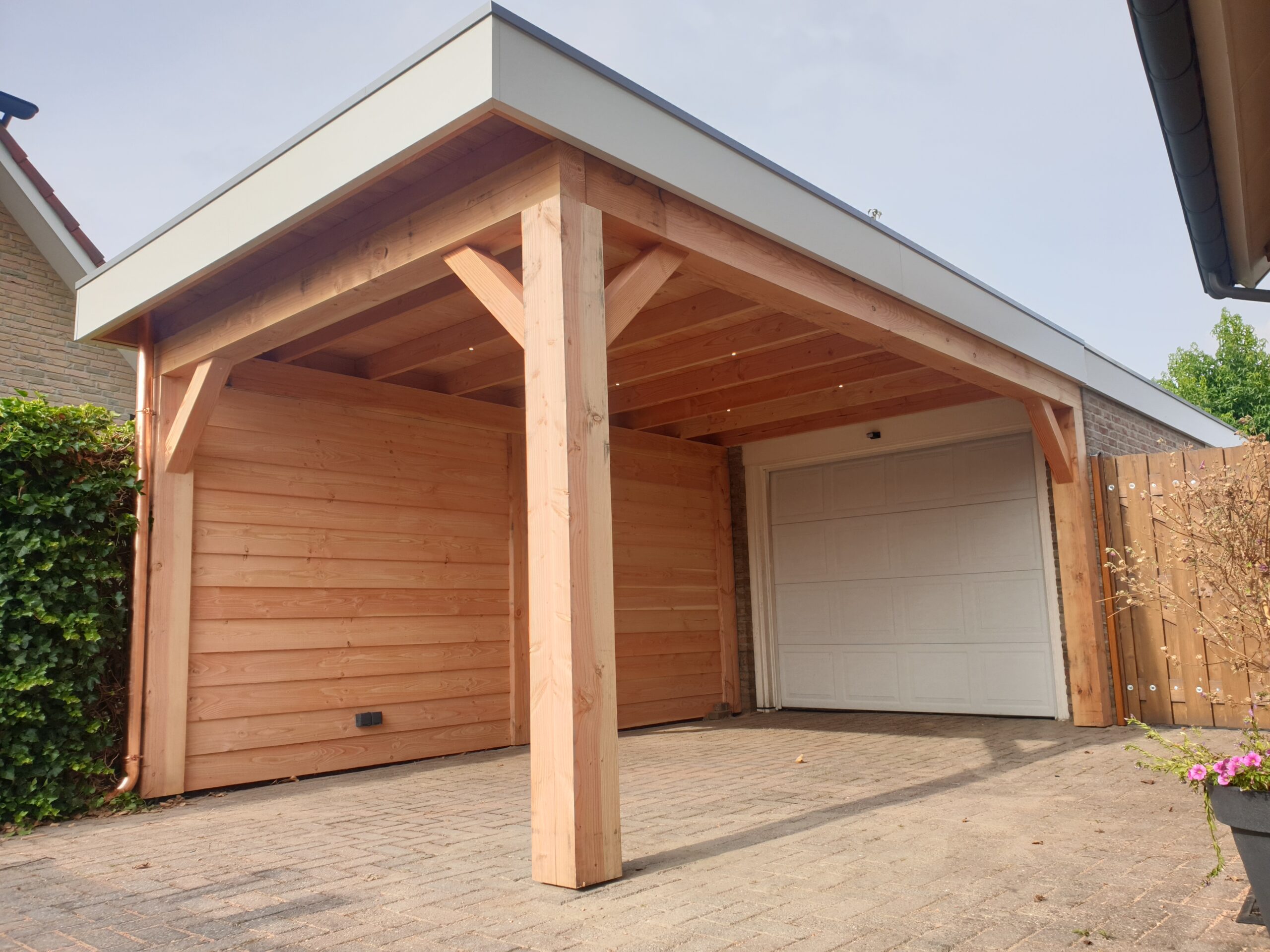 - Carport: Een open overkapping die jouw auto beschermt tegen regen, sneeuw en UV-straling. Ideaal als je een praktische en luchtige oplossing zoekt.